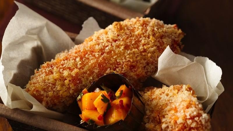 Diced mangos and a dash of Thai chili paste make for mighty spicy tenders—taste buds, get ready!