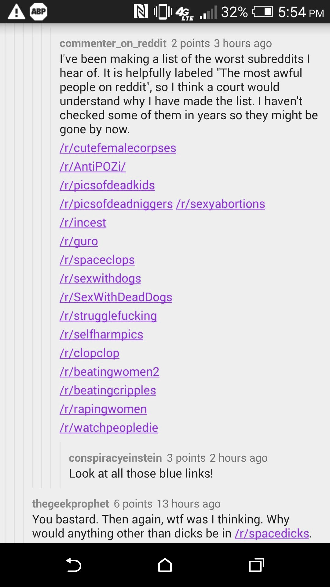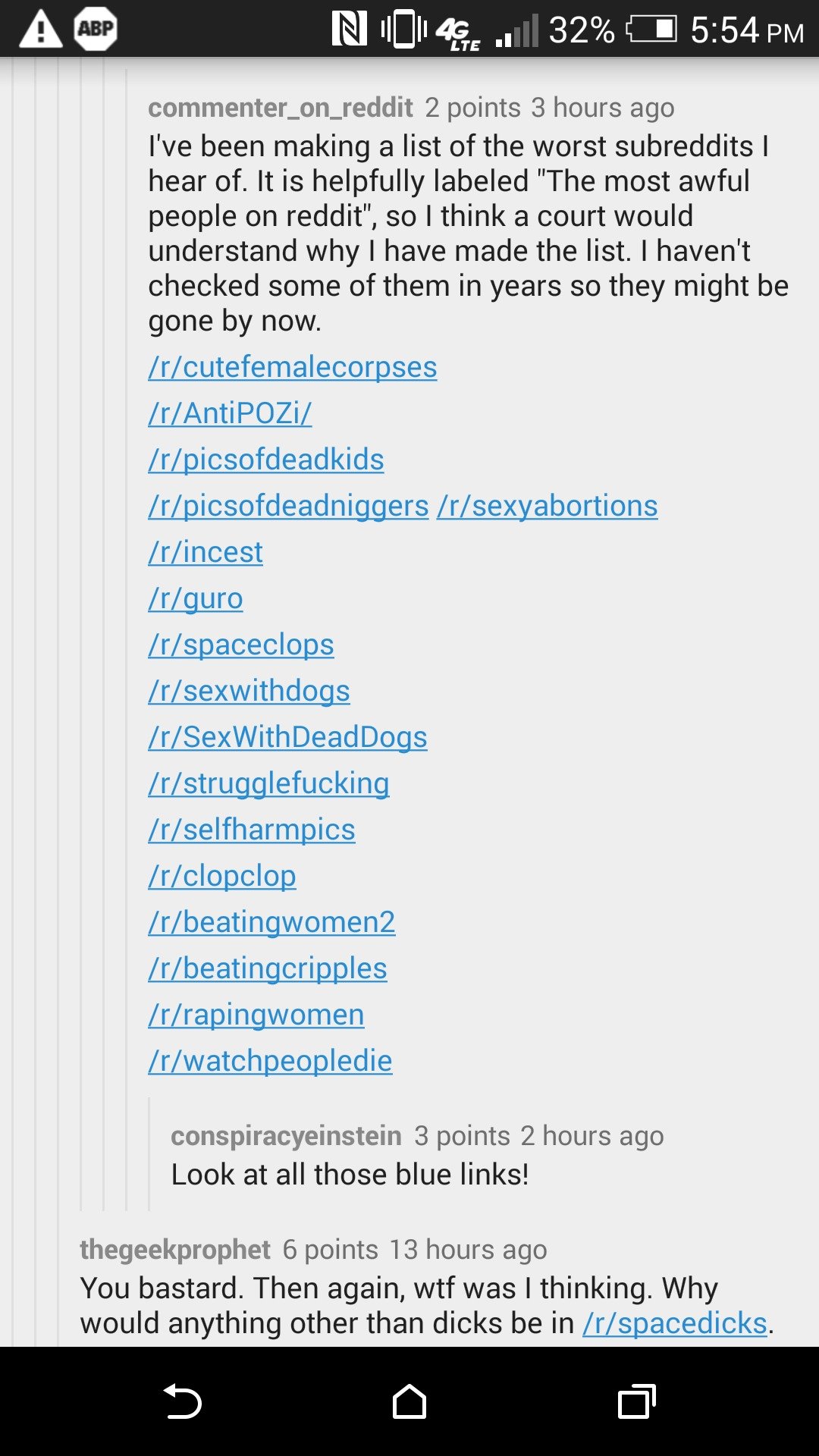 That's wrong, sure, some of what you said I did not know, but these subreddits are promoting death, hatred towards cripples and blacks, necrophilia, incest, gore, bestiality and necro-bestiality. Physically assaulting someone is bad, I agree, but ******* a corpse, ******* an animal corpse, remotely enjoying a video of a man being beaten with a pipe and then stabbed to death, laughing at dead children, dead people, thinking corpses are cute, beating cripples and whatever the **** else is listed is twice as wrong.