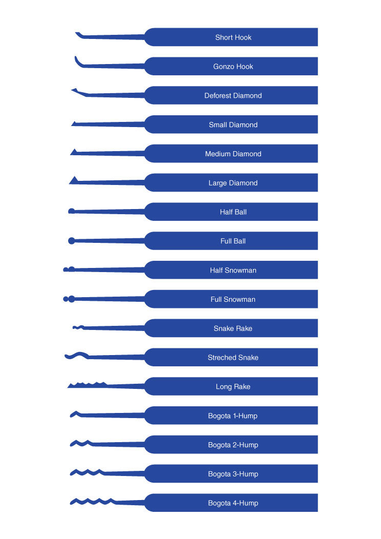 There are many different shapes, basically to make each different lock picking job a bit easier depending on the lock. Short Hook – Arguably the most useful pick, a must have default pick to feel out a lock and how its tumblers work (so you know how much tension to apply and generally how far up to push a pin, etc…) Used to pick pins one at a time. Diamonds – Second in command to the short hook. Good for pin tumbler or wafer locks. Apply tension, push into the pin and past it slowly so that the pin (not the pick!) goes up slowly, then back down. If you did not feel/hear a click, then repeat until you do. Then move to the next pin. Can also effectively be used as you would use a hook. Ball/Double Ball(snowman) – Best for wafer locks. Simply apply tension, put on a pin and jiggle till you feel/hear a click. Alternatively, push it in and out randomly with tension. Use the single ball first, if it doesn't work try the double. Snake – You’ll need a crafty combination of jiggle as with a rake, and finesse as with a hook. Long Hook – a bigger hook, for bigger locks, with bigger tumblers. Rake – These work magic with some locks, and will never work with others, depending on where the shear points are for each of the pins. Not to much art with these, just insert, apply tension, and jiggle. W-rake/Snake (Humps) – As with the rake it can either work wonders or do nothing. My experience with it is mostly the latter. Its angles are too sharp in my opinion to be effectively used as a snake.