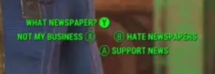 Again, my problem isn't with the dialogue itself. There's no problem whatsoever with the fact that "no" is the same as "not my problem." If this had happened in Fallout 3 or New Vegas and they'd given all the same dialogue options with the old setup, letting you know exactly what you're saying, I'd be happy.