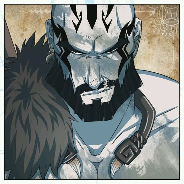 the particular scene is from when he was running bridge crews and sat on the edge of the "honor chasm" where many of the slaves fall off to take their own lives. He also doesn't have a vets or sandals because he dropped them on his way over after his slave owner told him to since he didn't want to fetch them at the bottom. and the word on his forehead that means slave then the other much newer word off to the left meaning "dangerous". not to mention his various battle scars.