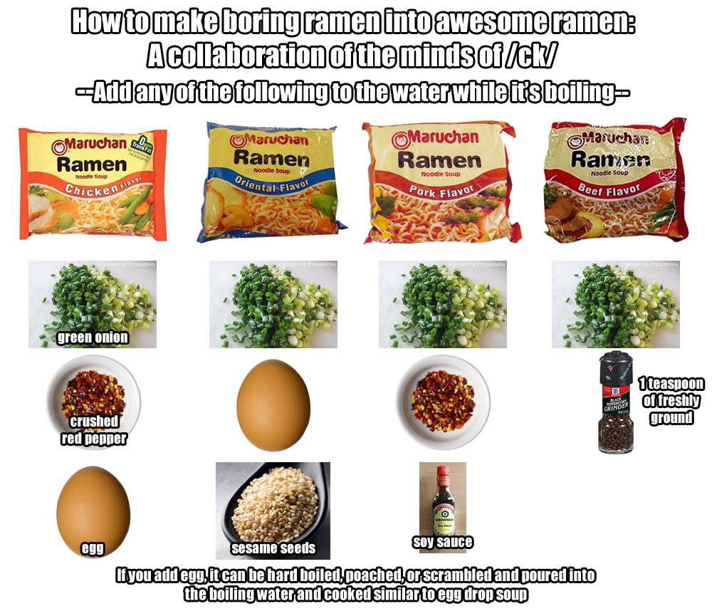 if you want to make something delicious, but don't have the right ingredients, then just use maruchan ramen or top ramen as a base and try some recipies