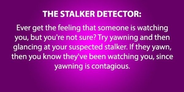 Here is another one. Actualy a tip from the FBI. If you're on stake out or something. And think someone has made you, or is watching you back. Pick your nose. People will usually look away and not take you as a threat because of the embarrassing situation .