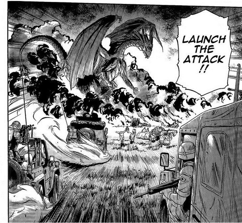 If you aren't allergic to weaboo **** , check out Gate Jietai Kare no Chi nite, Kaku Takeri, it's about a portal that opens in Japan and connects it to fantasy world. Then they proceed to shot at Roman empire style overlords and dragons and **** . That being said, it's gotta harem and typical weaboo stuff, so it might not be everyone's cup of tea, but you might like it. It's getting an adaptation next month too