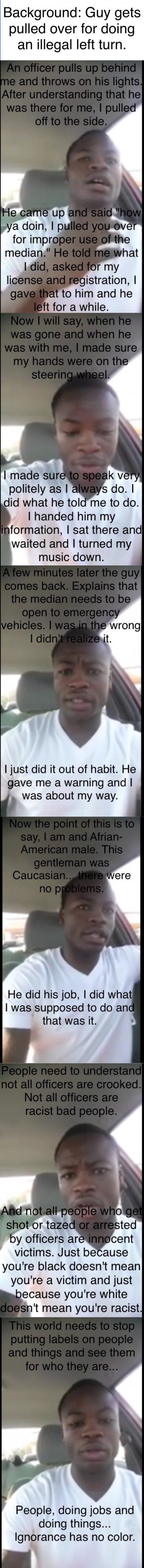 This is completely true, but people should also not take this scenario as evidence that racism does not exist in the police force, it does, but it doesn't help to be prejudiced. A black person shouldn't automatically look at a cop as a racist who's out to get them, and a cop shouldn't automatically look at a black person as suspicious and a criminal.