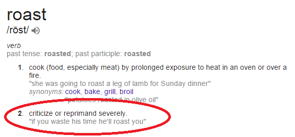 What? I thought roast was to diss someone in a humorous manner. To make a joke at someone's expense. It sure as hell isn't "being severely criticized or reprimanded".