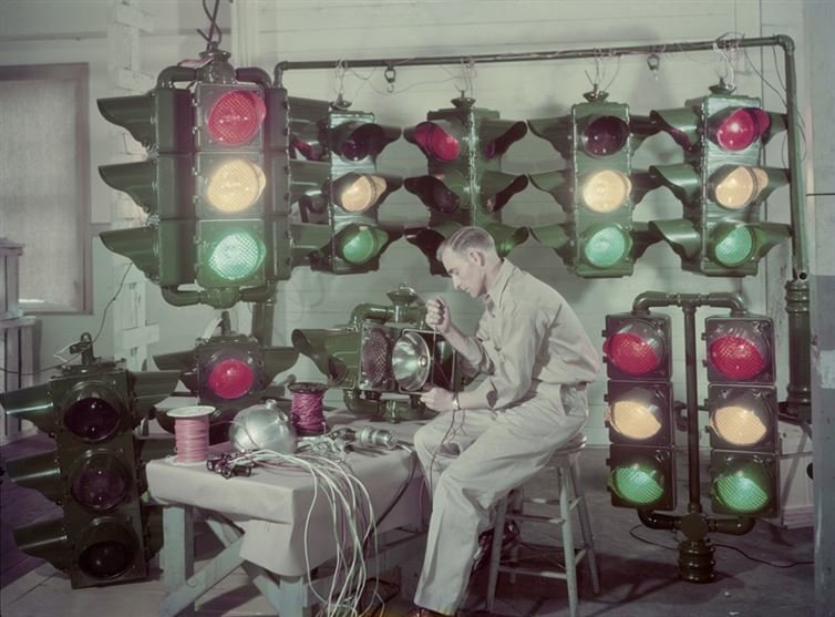 Traffic lights are made in Shreveport, Louisiana, and sent around the U.S. and abroad, December 1947.