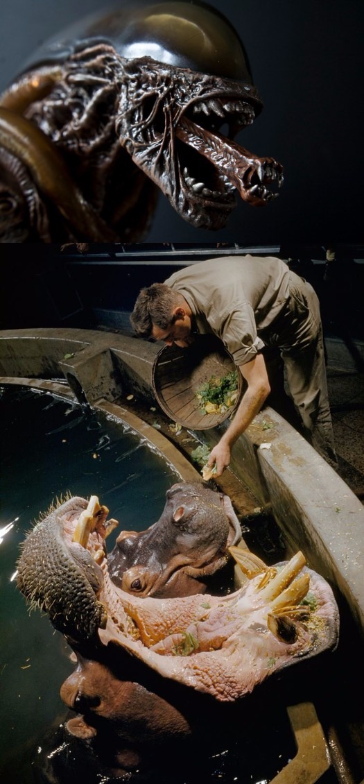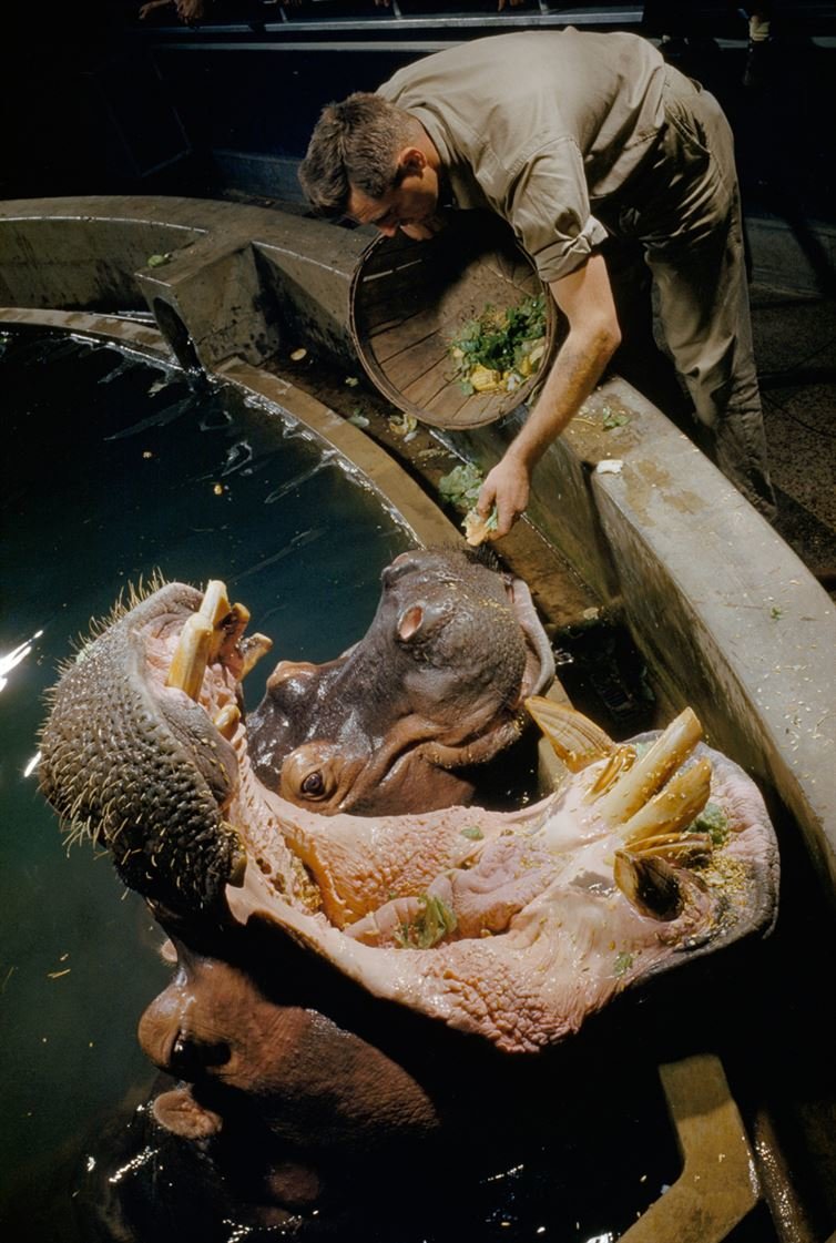 A hippopotamus and his mate line up at tank’s edge at feeding time, March 1957.