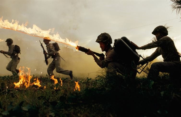 Marine infantry in Taiwan practice using flame throwers in a simulated battle, January 1969.