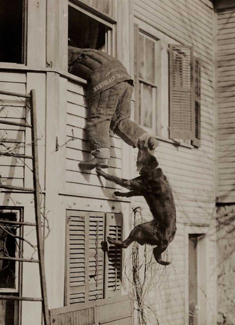 A police dog bites the ankle of man during a training session, March 1919.