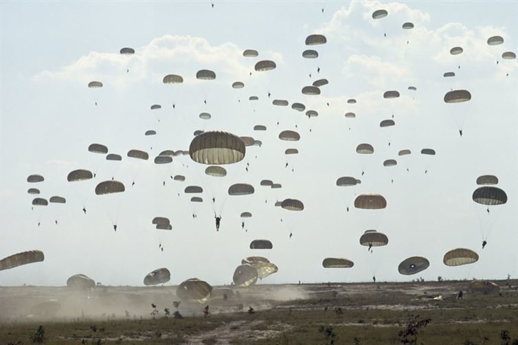 Paratroopers in training land in a dusty field at Fort Bragg, North Carolina, February 1962.