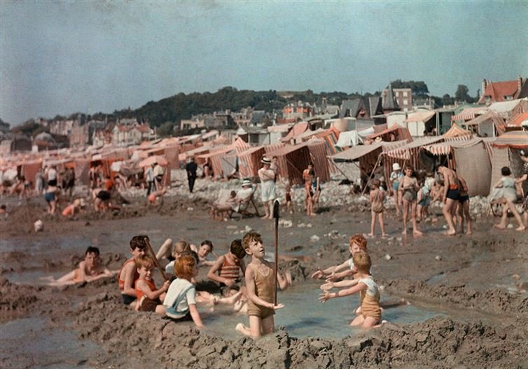 Children play in pool they have dug out of the sand on the beach in Le Havre, France, 1936.