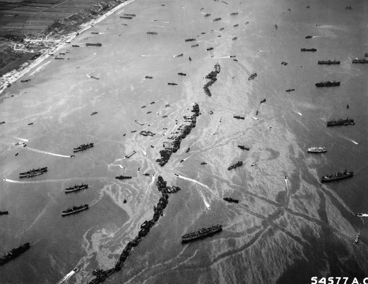 Aerial view of harbor created to supply the invasion of Normandy, June 1944.