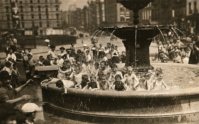 Newspaper boys cool off in a New York City park fountain, April 1916.