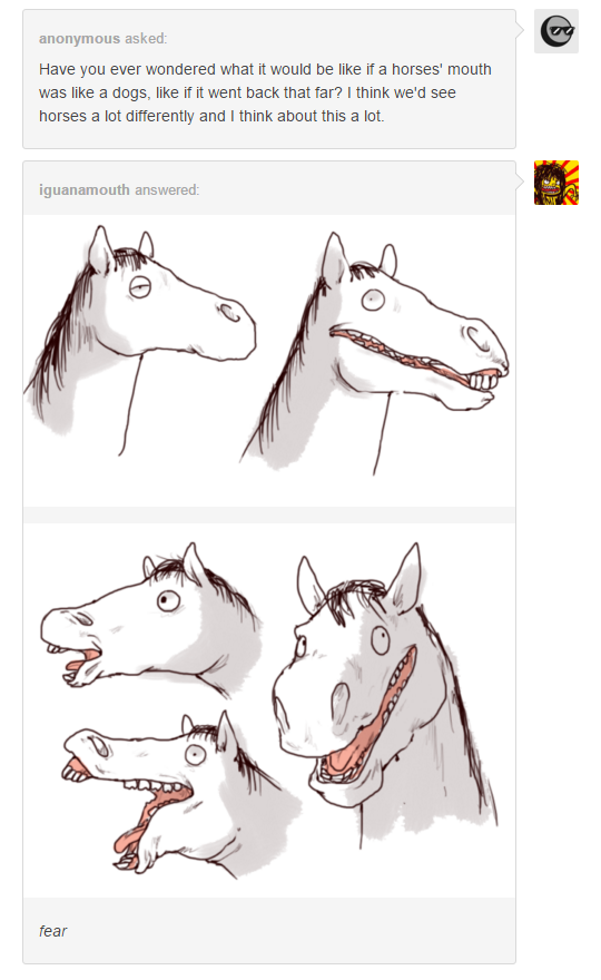 This is the exact reason why zombie horses/deer/moose are really frightening to me, and it doesn't even make sense because I normally LOVE Glasgow Grins.