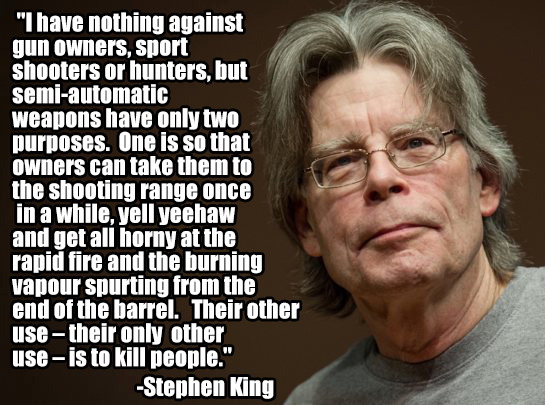 I know this is just a roll, you probably won't know, hopefully someone passing by might reply to this to help me understand what he means. Now I understand people not wanting automatic weapons available to the public, I mean, I would love to own one just because, but in reality I know it's highly unlikely I would ever need it for a serious purpose. So no reason to get mad, I get that. But what is Stephen's problem with Semi Auto weapons? Is this a meme because what he said is stupid and it's funny? Is this a meme because it's funny but I'm too serious? Or is it a fake quote made to **** with guys like me?