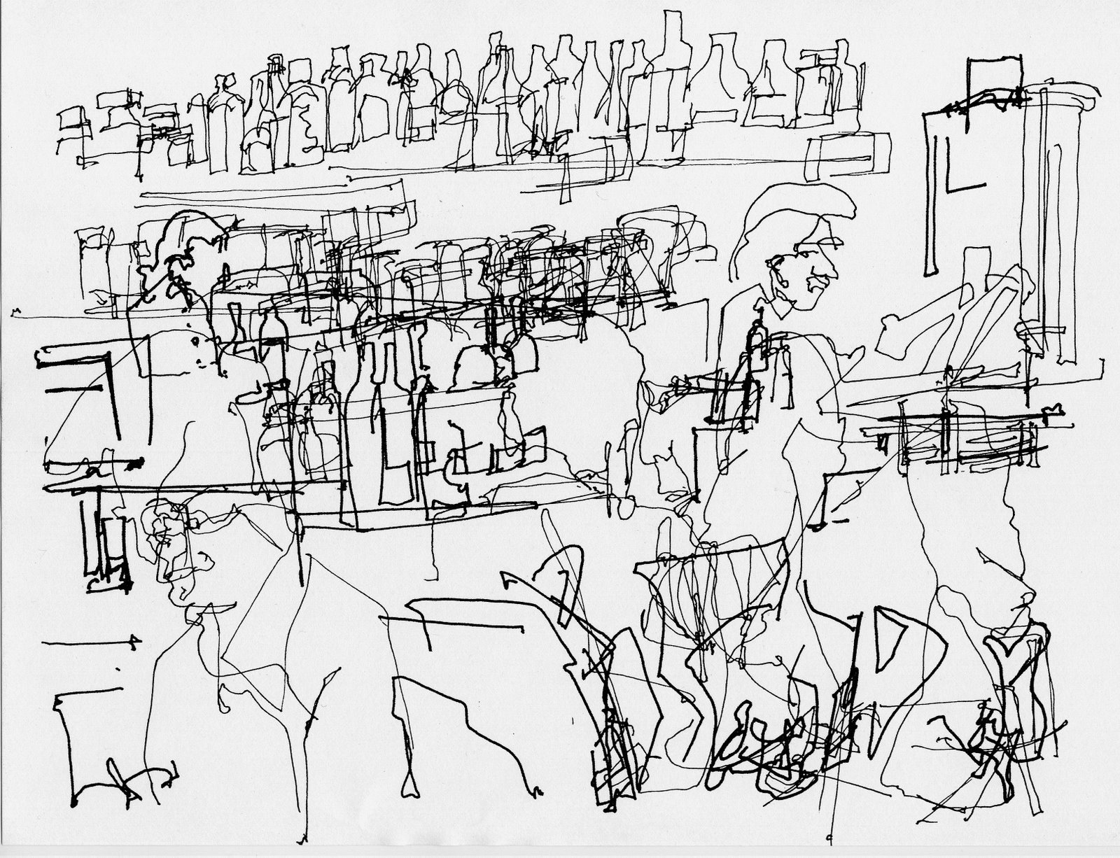 The process is to put your drawing implement in your non-dominant hand. Then, keeping your eyes on your subject - don't look at your paper - start to get down the basic shapes and arrangement of the objects you are drawing. After getting everything down initially, you should look down at your paper more frequently but most of the time you should keep your eyes on your subject.