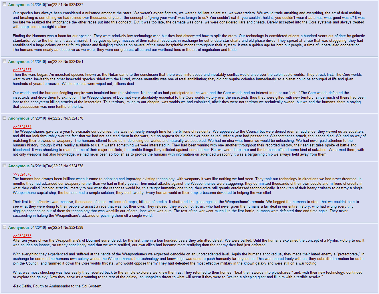 I reported my findings back to our Council and they deliberated of the fate of this race. This civilization so prone to civil war, our strategists assumed that we would be able to silently pick off