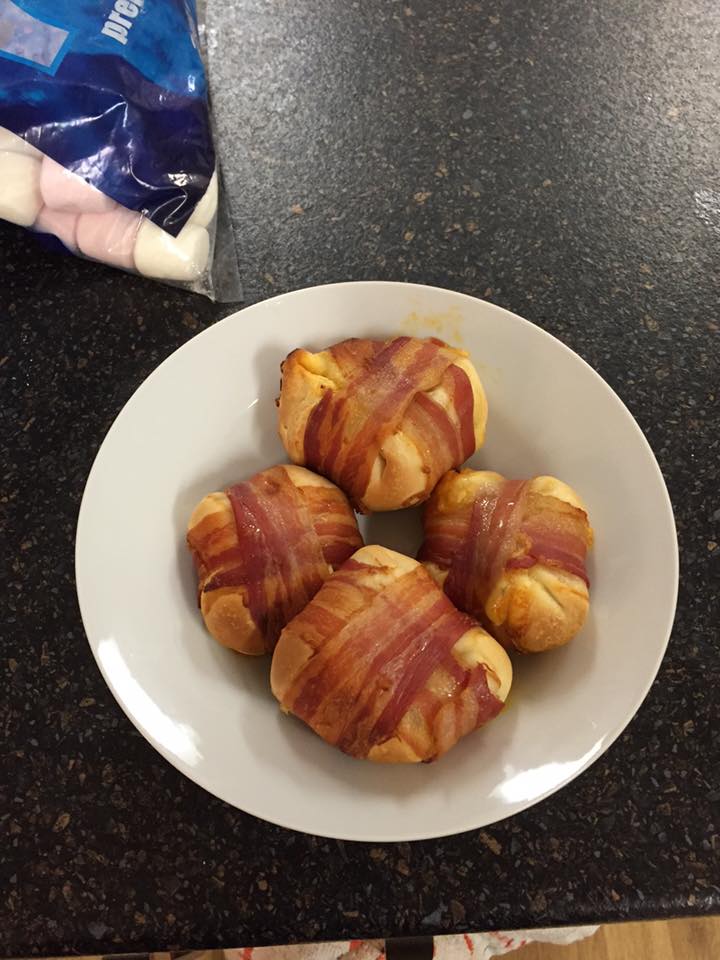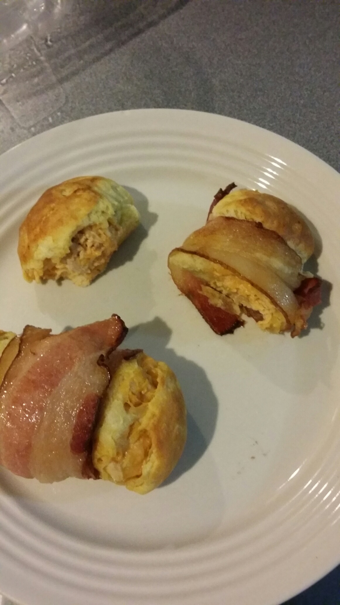 To make each bomb, place 1 large tablespoon of buffalo chicken in the center of a flattened biscuit. Top with 1 cheese cube. Pull edges of biscuit up and over filling; pinch seams to seal securely. Wrap 1 slice of bacon around bundle.