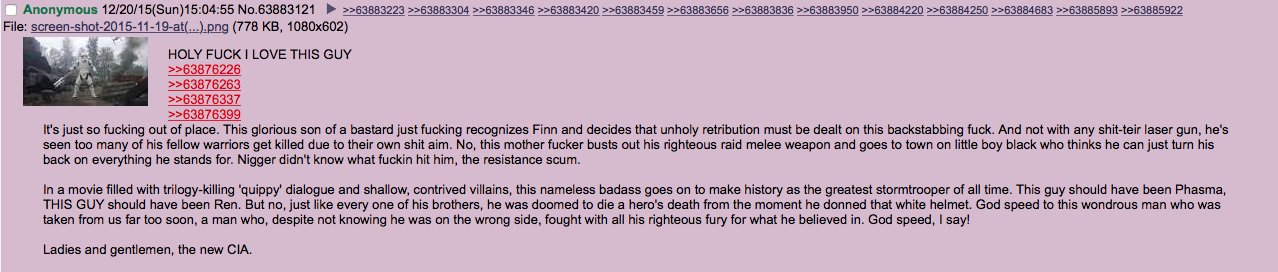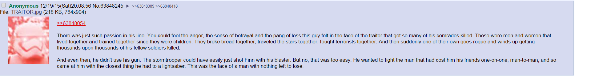 This ******* guy was amazing. I couldn't believe that a ******* nobody with a shock baton could go toe to toe with a light saber. It was epic seeing such a random trooper kick so much ass. I was really disappointed that Captain Phasma got rekt before we got to see her in action. If this ******* guy could pull what he did off, just imagine what Phasma could've done.