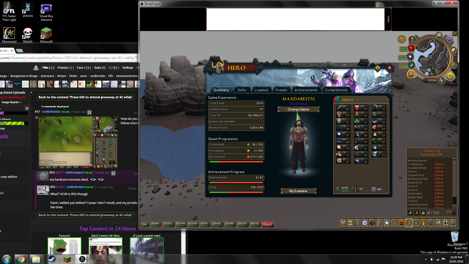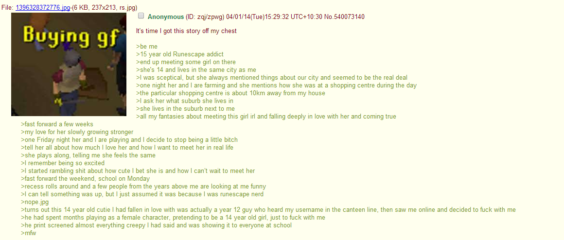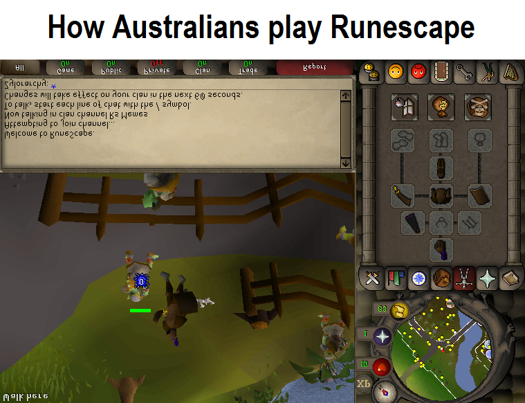 Meh, IDGAF. Runescape was fun to grind back in the day when I was a younger, but now I don't have the time or the effort. I still enjoy playing to experience what it was like when I didn't know the map or the way around, just winging it and thinking cooking shrimp was the ******* bomb, but it just doesn't do what it did for me back then. It's something I want back, but I'll never have, so instead of reminiscing on those memories, I want some new video game memories to be made. I want to play the best games out there and experience the thrill of playing it for the first time. The only game that can recreate the feeling time after time is FFX, my all time favourite. I can't find anything else to match that amazing feeling, so runescape just feels like a drag to me because I can't make it happen.
