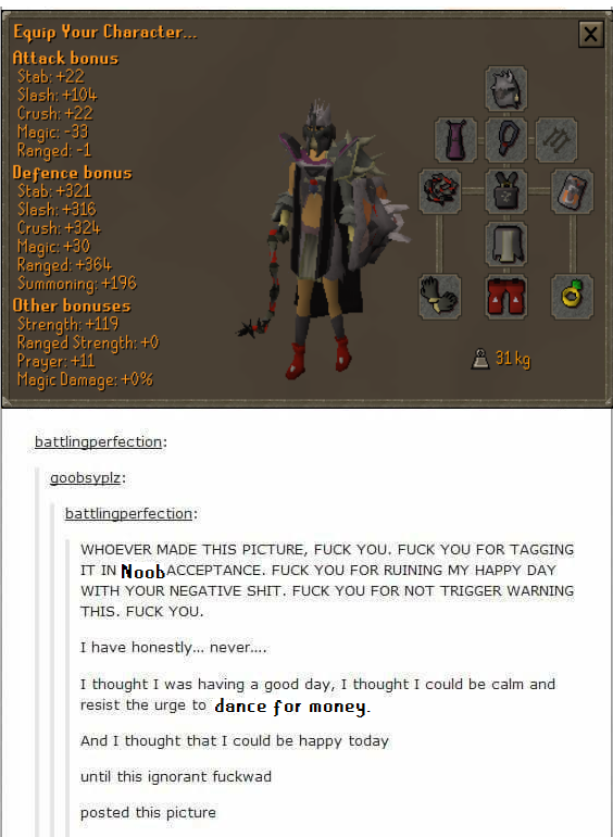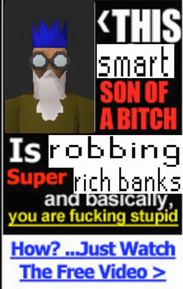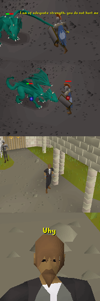 I just barely started playing runescape again for the nostalgia, and now i've been seeing multiple runescape posts on funnyjunk. It must be the ancient prophecy, I was destined to play runescape on this day. All Hail Saradomin. also if you played runescape when you were a kid I think you should try it again, preferably with a friend. It's a lot more fun now that im older and I dont suck dick at video games.
