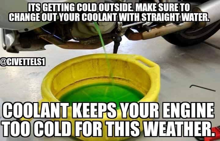 i was wavering on the first one, because what are spikes but some metal in the tire. but the other "tips" gave it away. i dont know **** about cars but letting the motor run and draining oil or to substitute coolant with water just did sound like ********