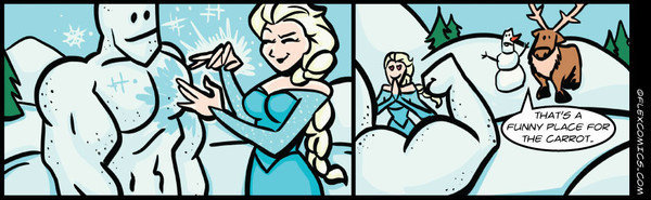 When it was done, there was something left. We had to indulge in some carrot theft. To make him whole, we raided the salad bowl to give him a classic nose. I tripped and fell when I put it on; stuck the veg where it didn't belong. I aimed for the face but hit below the waist, and now he's got a root vegetable dong, HE'S GOT A CARROT FOR A COCK!