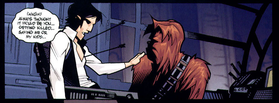 I would have loved a scene where Han and Leia had another kid. They're about to be swarmed by troopers and Chewie who is basically this kid's uncle stays behind to hold off the troopers while the others escape I always wanted to see how Chewie and Lando interacted with Han's kids.