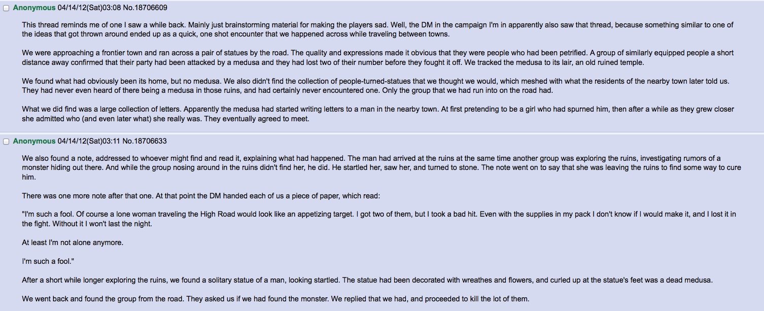 This thread reminds me of ans I saw a while back. Mainly just bradistan' ning material fer making the players sad. Well, the in the campaign I' m in apparently alea saw that thread, because samething similar ta ens of