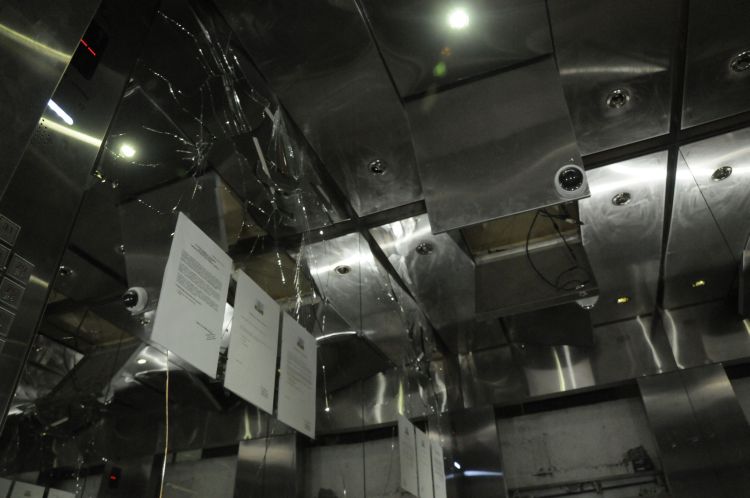 and on some buildings those elevators can go up to 80 miles an hour, so you can imagine an a thin metal box with no restraints hits an immovable object (the building) at over 60 mph is ganna cause injury. if you were in a car you be ejected out the window like it was ******* GTA