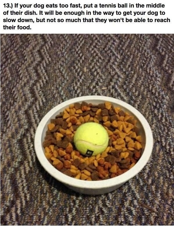 13.) It your dog eats too fast, put a tennis ball in the middle