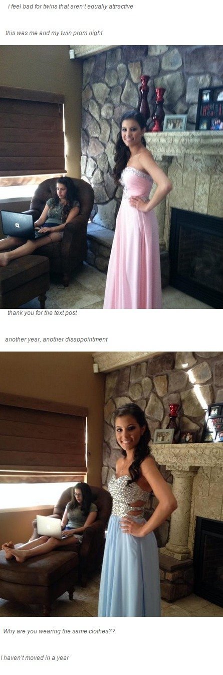 I'm super happy I don't have a sister so I can't be considered "the ugly one" I mean, my brother is the more attractive of the two of us, but ehh not having a girl to constantly be compared to is nice