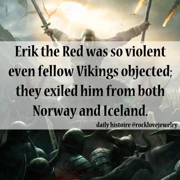 Nah, just half-truths. Eirik Raude wasn't "Too violent", his dad got exiled from Norway when he was a kid. Later on his thralls managed to avalanchify his neighbour, who promptly killed the thralls for wrecking his farm, which led to Eirik killing that guy and having to move. Then he managed to start a fight over some benches he'd lent to some guy, and in the ensuing battle two of that guy's sons died. Which got him exiled, because **** .