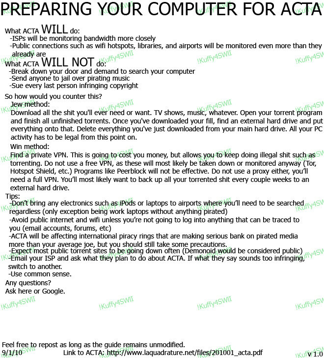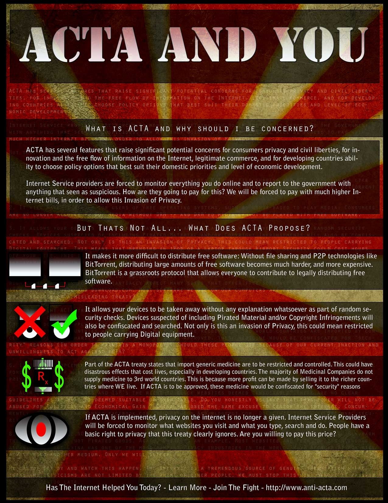 "If ACTA is implemented, privacy blah blah.... .... .. ISP will monitor you, and (other ways to say "monitor you" to make sentence more dramatic) " Propagandist BS that doesn't need counterarguments. Hey, wait a second.. Doesn't monitoring to that extent already happen?
