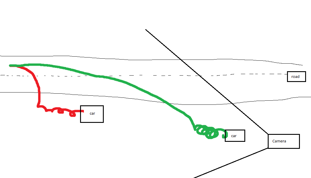 Took me a while but I figured it out now. It's filmed with a zoomed in lens and makes everything seem slow, but in fact the car is probably doing around 100Mph/160Kph if not more. I'll draw the optical illusion. The red is what you might think is happening, the green is highly likely the scenario occuring in the clip.