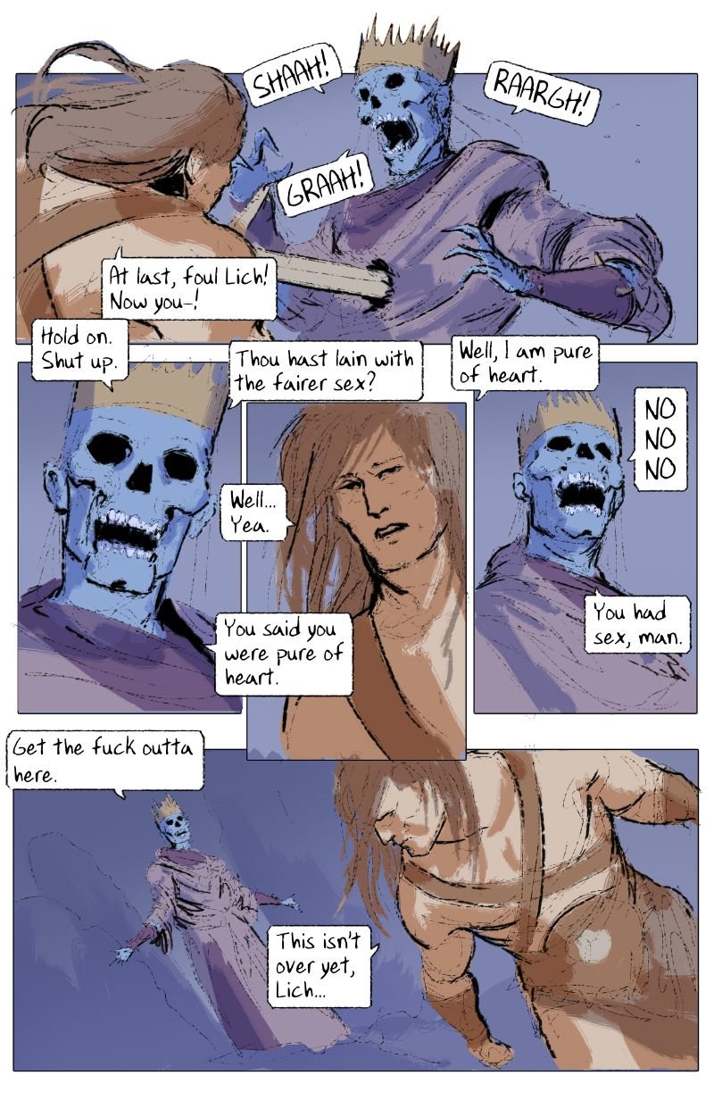 Another warrior shows up, says he's pure of heart, stabs lich, fails.