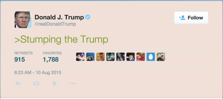 Nice meme tbh. This one happened last month It's like you never even seen his rallies. It's pretty much the only thing he talks about for the first 10 minutes.