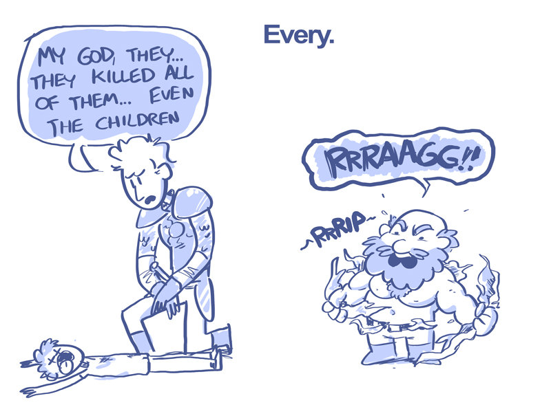 The paladin tries to shrug the pain in his eyes off, but fumbles again, and instead ends up flayling his arms around while yelling in pain at the top of his lungs, while the rest of us watched from the basement entrance in sheer disbelieve. He knocks over several shelves and soon the room is filled with an obnoxious mix of gasses from all the broken bottles of perfume now littering the floor. The gas is enough to knock the armoured dumbass out, and it took us two attempts to drag his ass into safety (the first time around the brave soul that ventured into the gas chamber to retrieve him had to turn back while trying not to throw up), and it took us a long time to get him back on his feet. From here on out he wasn't allowed to be without one of the others to prevent him from spectacularly ******* up again, and thankfully nothing like that happened.
