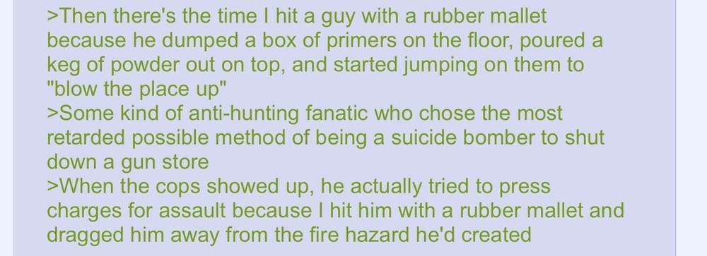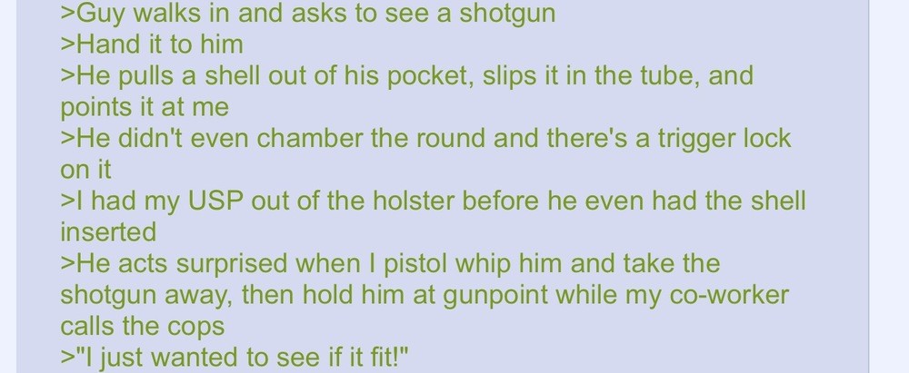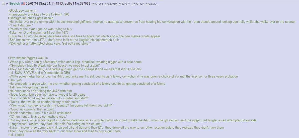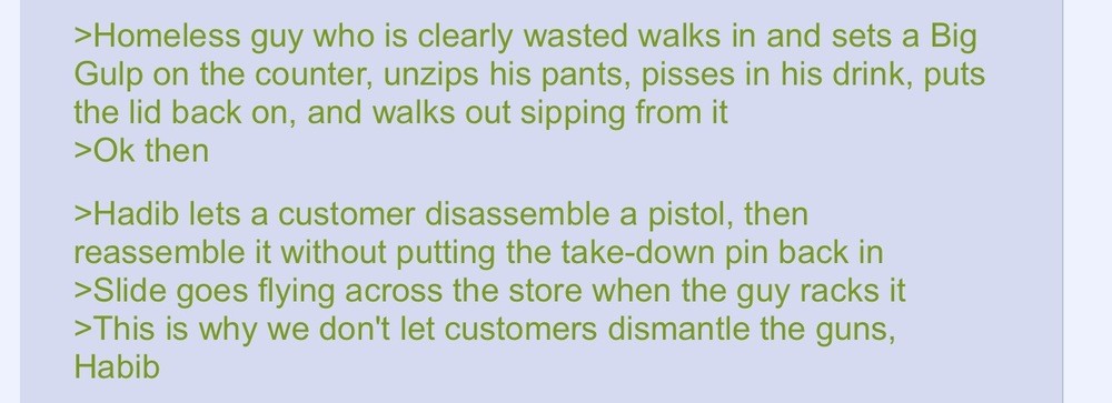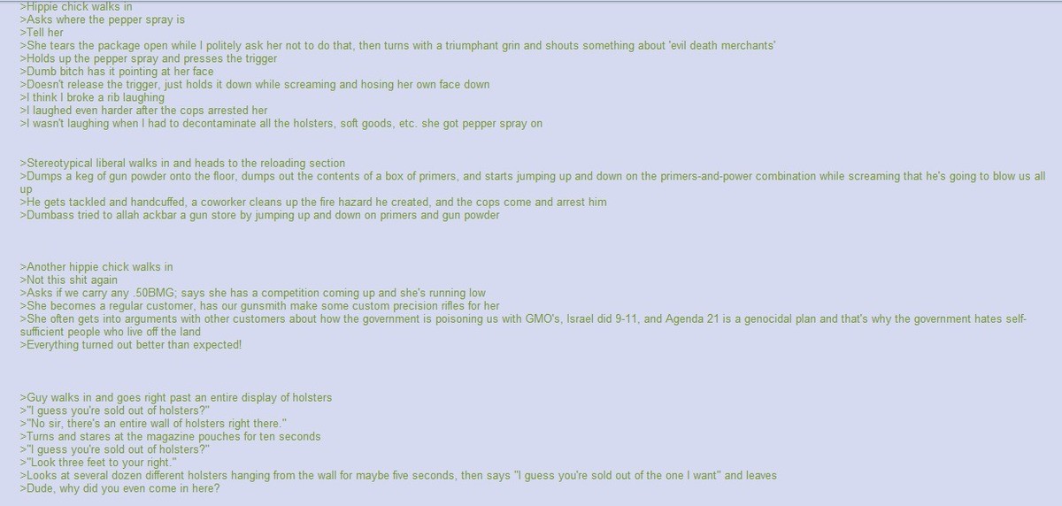 sgtmajjohnson (03/08/2016) [-] Goddamn, and people think customer service in general sucks. Imagine if you're selling weapons to all of these idiots, and have to deny service to many of them. This is how you wind up hating people.