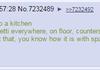 Home out to kit: hen, spaghetti everywhere, on floor, counters, walls, in sink and on stove
