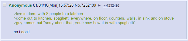 gguy comes out "sorry about that, you know how it is with spaghetti"