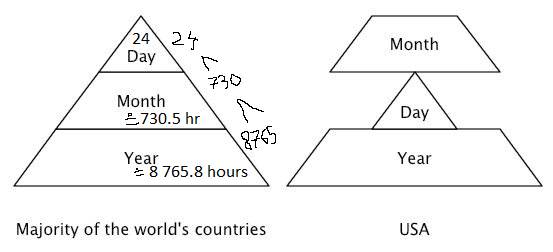 Yeah but what you say has no ****** sense.. It's the actual "volume" of TIME that matters not how many possible numbers/symbols you can place on whatever position writing from left to right... Days have 24 Hours thus they are the smallest "bag of numbers/layer of the piramid) ... Months have .... and so on