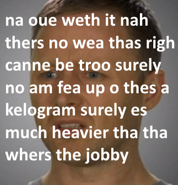 "No, get out with it, there's no way that's right. This can't be true surely. No, i'm fed up of this. A kilogram is surely much heavier than that. Where's the toilet?"