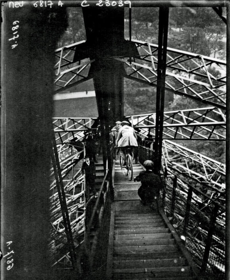 Piere Labrie (?) cycling down the Eiffel Tower, 1923