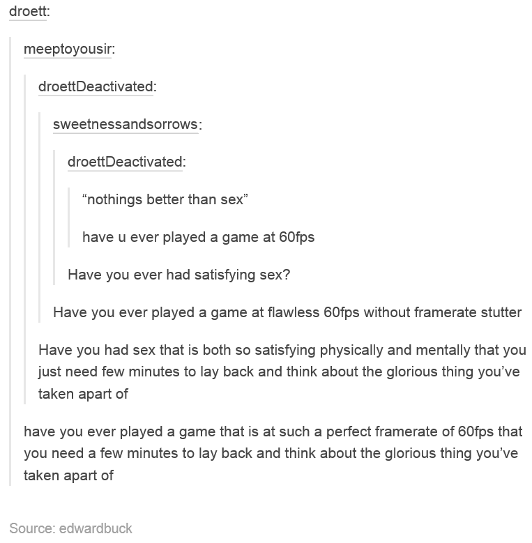 I'm not saying that sex isn't hella neat, but to be so god damned dramatic about it, really makes me cringe. A virgin would be too obsessed with getting laid, to even consider the fact that dramaticising it, would be ******* silly.