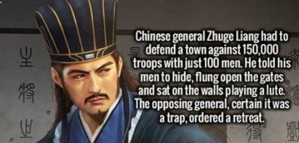 Regarding Zhuge Liang, the tactic is known as the empty fort strategy. His men were not told to hide, they were instructed to sweep the streets and be in full view, it was also for like a couple thousand into the city and about 50 thousand trying to take it. The only reason it worked was because the opposing commander had been victim to Zhuge Liang's strategies before and so was very cautious. It's also unlikely to have happened and was probably the author adding some interesting flavor to the Story. Romance of the Three Kingdoms, read it, you'll be a better person for it.