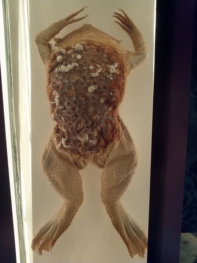 The common Suriname toad is similar in appearance to a mottled brown leaf, and is almost completely flat. Its feet are broadly webbed with the front toes having small, star-like appendages. Specimens of close to 20 cm (8 in) in length have been recorded, although 10-13 cm (4-5 in) is a typical size. The Suriname toad has minute eyes, no teeth, and no tongue.