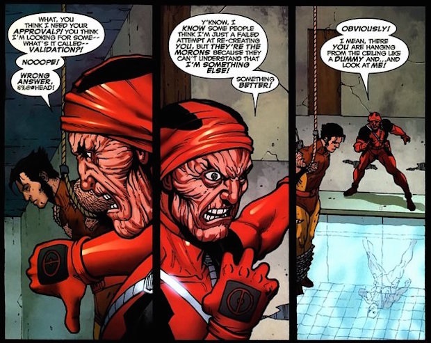 Yeah looks like I was right, this is just a random page torn from a cable and deadpool comic. Deadpools got split personalities, his usual one is yellow with black text, white with black text seems to be more his voice of reason and mercy, and yellow with red text seems to be his psychopathy talking.
