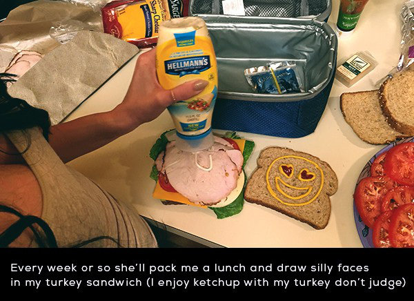 And occasionally does quirky stuff like buying a kiddie pool and drawing a face on a sandwich? And ordered pizza for dinner.